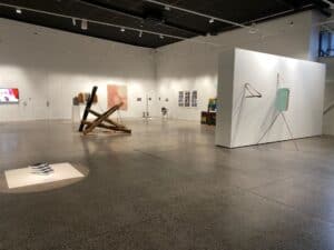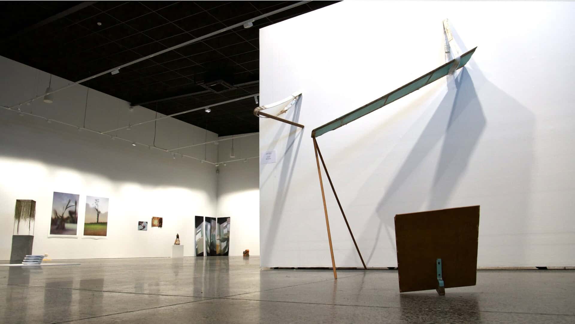 Joint Winner 2025 Bryony Matthew 'untitled' Iteration #5 Found discarded painted marine ply, found used brass gutter brackets, used webbing straps from steel manufacturer, blue painted bracket removed from derelict house, found ply with existing marks, acrylic paint, wood offcuts from skip bin. Artist : Bryony Matthew